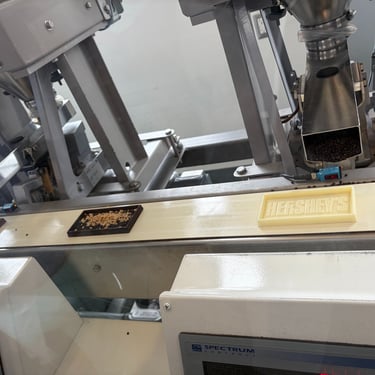From there, you move into the production area where your chocolate bar is actually made. You can watch it travel down the conveyor belt, see the mix-ins added, and even spot your name on the big screen showing which number your bar is on the line. This was a huge hit.